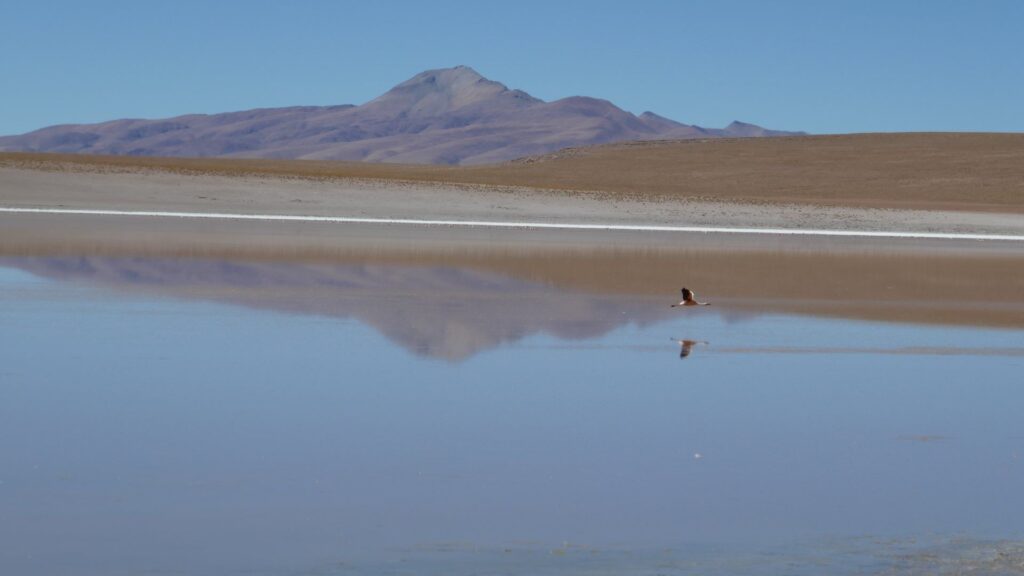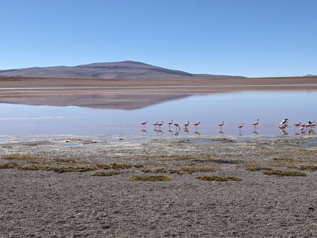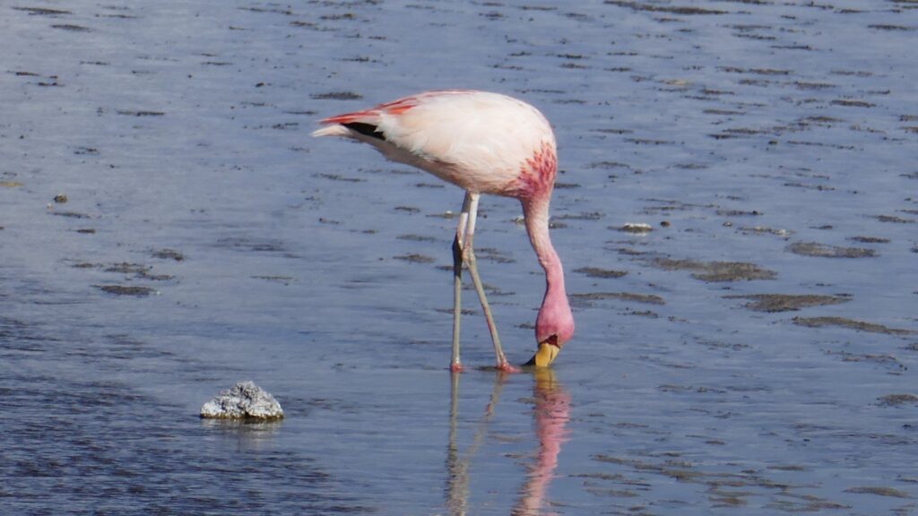 In der Laguna Verde auf 4.500 m leben alle 3 in Südamerika vorkommenden Arten. Sie unterscheiden sich nah der Farbe der Beine. Der hier gehört  Typ James nach seinem Entdecker.