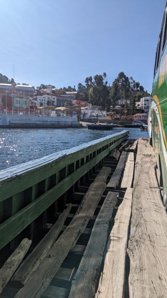 Ein Linienbus auf einer Fähre aus Holz. Das schwankt ganz schön. Froh, am anderen Ufer angekommen zu sein.