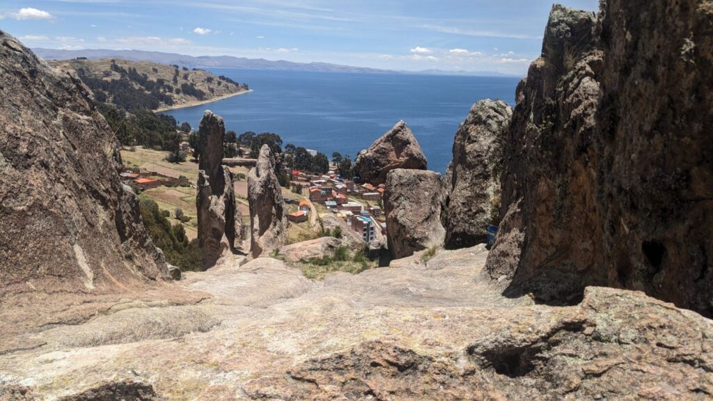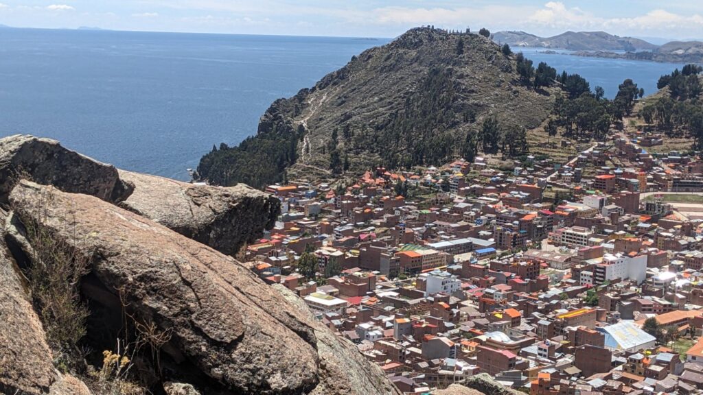 Wir klettern auf den Hausberg Horca de las Incas und haben diese Aussicht über Copacabana: